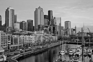 A timeless black and white view of the Seattle skyline rises above Bell Harbor Marina. The city’s modern towers and historic landmarks create a strong architectural rhythm along the waterfront, while moored boats add balance and depth to this classic monochrome perspective of downtown Seattle.