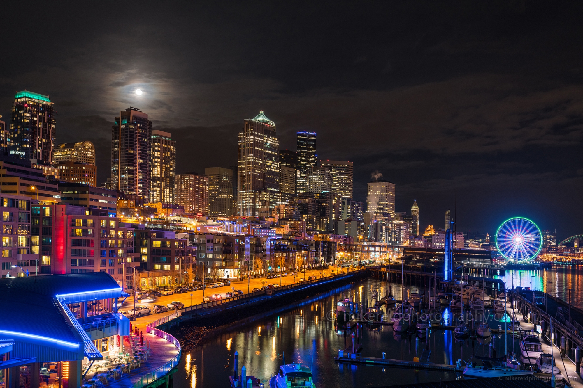Moonrise over Seattle’s Bell Harbor with illuminated city skyline, glowing waterfront reflections, and the Seattle Great Wheel shining at night.