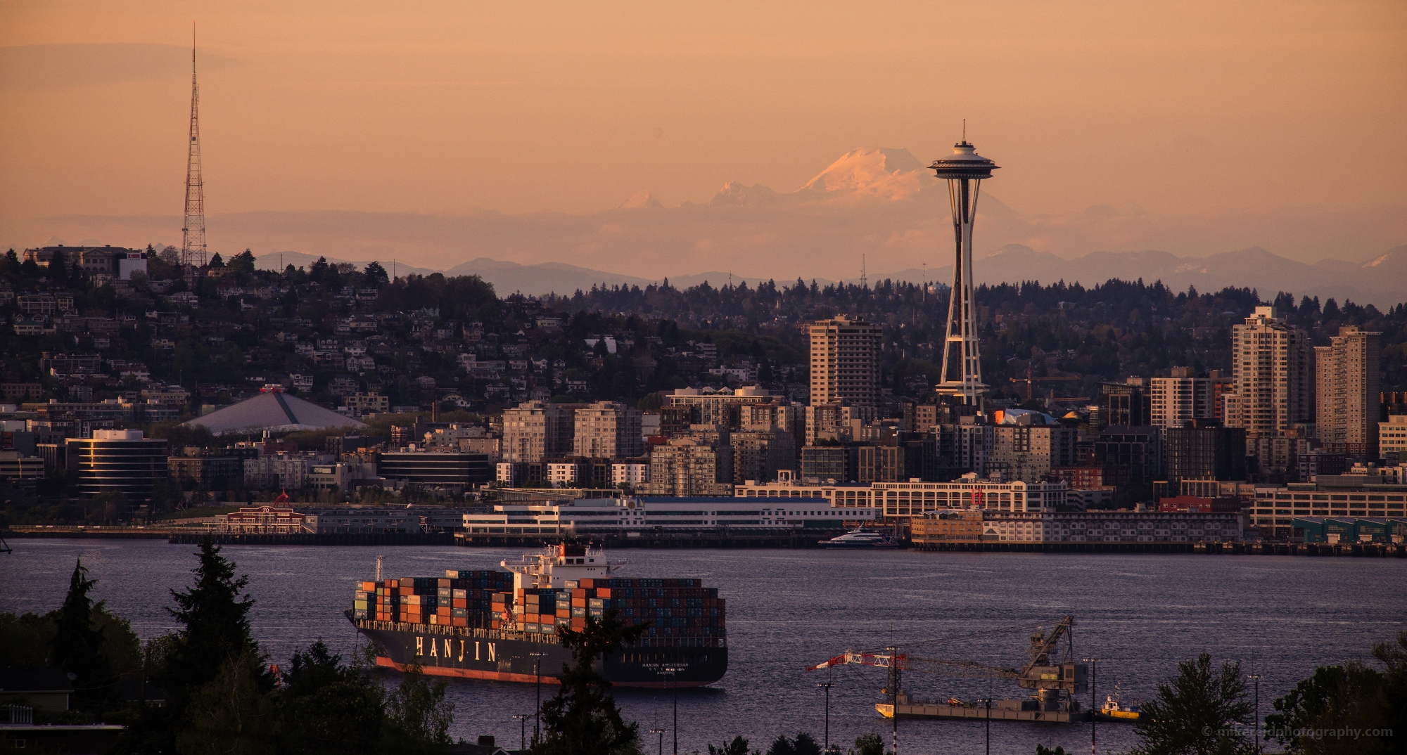 The Seattle skyline glows in the soft light of dusk as the Space Needle stands tall above the city. In the distance, snow-covered Mount Baker rises through the warm haze, creating a stunning contrast between Seattle’s urban waterfront and the Cascade Mountains beyond. A container ship glides across Elliott Bay, adding scale and motion to this serene Pacific Northwest evening scene.