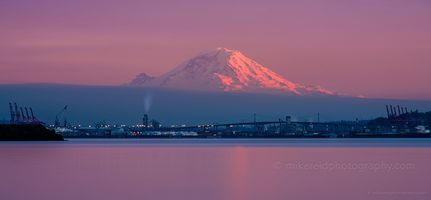 Mount Rainier glowing in pink alpenglow above Tacoma’s waterfront and industrial port at sunrise, with the city bridge and calm waters of Puget Sound in the foreground. Canon 200mm f1.8