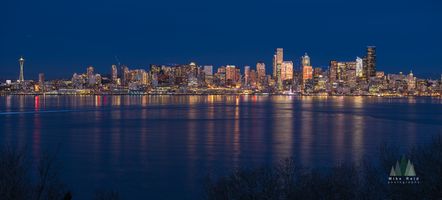 Panoramic Seattle skyline at blue hour viewed from West Seattle, with the Space Needle and downtown buildings glowing above Elliott Bay and their reflections shimmering on calm waters. Fuji GFX100s medium format camera.