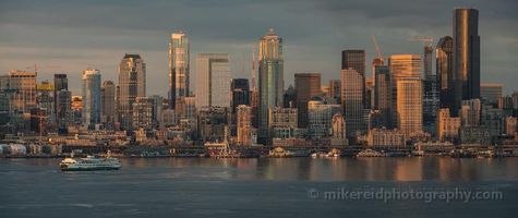 A Washington State ferry glides across Elliott Bay as the Seattle skyline glows under golden sunset light. The city’s towers shimmer with warm reflections, contrasting beautifully with the calm bay waters. This classic waterfront view captures the energy and elegance of Seattle’s downtown skyline as day turns to evening.