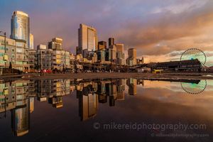 A striking golden hour view of downtown Seattle’s waterfront reflected perfectly in a puddle along Alaskan Way. The warm evening light bathes the city’s glass towers and the iconic Seattle Great Wheel in a radiant glow, while dramatic clouds drift across the sky.