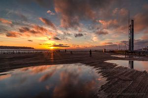 A brilliant sunset breaks through drifting clouds over Elliott Bay, casting golden light across a rain-soaked Seattle pier. The calm puddles on the wooden planks mirror the glowing sky, creating a perfect reflection of color and atmosphere. A quiet moment at the waterfront that captures the essence of Seattle evenings after the storm.