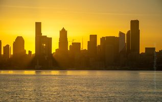 Seattle skyline at sunrise with brilliant golden light shining through downtown skyscrapers and reflections over Elliott Bay.