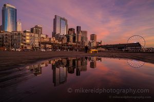 Downtown Seattle glows in soft pink and gold light as sunset colors reflect perfectly in a rain puddle along the waterfront. The city skyline, modern architecture, and the Seattle Great Wheel create a serene balance between urban energy and quiet evening calm — a classic Pacific Northwest moment after the rain.