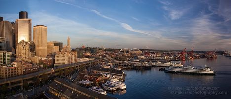 A sweeping view of the Seattle waterfront and skyline as seen from the Great Wheel, bathed in warm afternoon light. Ferries line the docks below, while Mount Rainier rises faintly on the horizon beyond the city’s stadiums. The historic Smith Tower and modern high-rises together frame this classic Seattle scene — a perfect blend of waterfront life, architecture, and Northwest atmosphere.