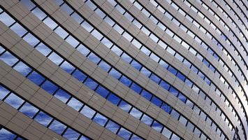 An abstract architectural composition featuring rhythmic patterns of glass and steel as windows mirror the deep blue sky and passing clouds. The diagonal perspective transforms this modern façade into a geometric artwork of light, texture, and reflection. Captured in downtown Seattle, this fine art photograph celebrates urban design and symmetry.