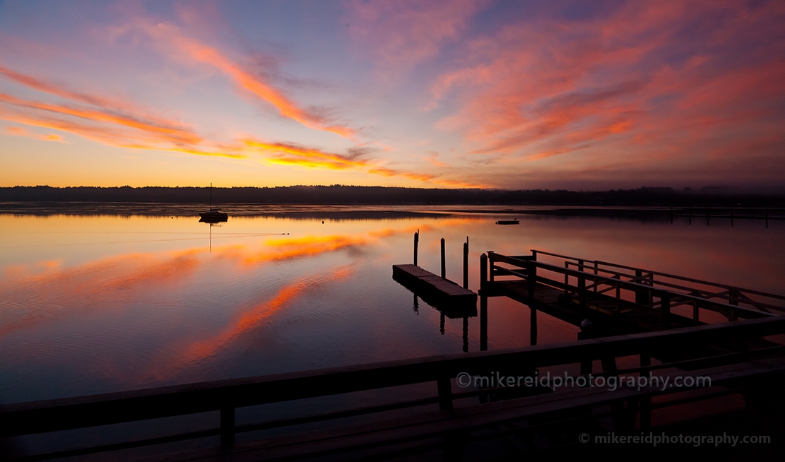 A tranquil morning unfolds over Hood Canal as soft pastel clouds reflect on still water, creating a mirror-like calm. The wooden dock and distant sailboat add to the sense of serenity, perfectly complementing the warm sunrise glow spreading across the sky. Captured in the Pacific Northwest, this peaceful landscape embodies the quiet beauty of early morning along the Washington coast.