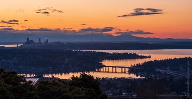 From the hills of Somerset, this sweeping sunset view looks west across Lake Washington toward the Seattle skyline and the Olympic Mountains beyond. The I-90 bridge glows softly in the fading light, while warm reflections ripple across the calm waters below.