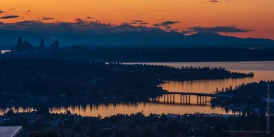 From the hills of Somerset, this sweeping sunset view looks west across Lake Washington toward the Seattle skyline and the Olympic Mountains beyond. The I-90 bridge glows softly in the fading light, while warm reflections ripple across the calm waters below.