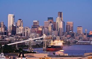 A cargo ship loads at Seattle’s iconic grain elevator as evening light glows across Elliott Bay and the city skyline beyond. The warm industrial tones of the waterfront contrast beautifully with the glass and steel of downtown Seattle, creating a vivid balance between commerce and city life.