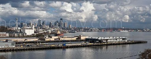 A dramatic view of Seattle’s skyline unfolds under towering storm clouds as Pier 90 and the city’s busy waterfront stretch along Elliott Bay. The Space Needle stands proudly against the shifting light while a cargo ship loads at the grain terminal, capturing the perfect balance of industry and beauty.