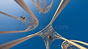 This striking upward view beneath the US Science Pavilion arches at Seattle Center celebrates over 60 years of Space Age design and architectural elegance. Originally built for the 1962 World’s Fair, these soaring white lattice arches remain a symbol of innovation and optimism, their graceful lines rising toward a vivid blue sky.