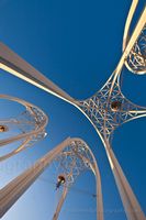 This striking upward view beneath the US Science Pavilion arches at Seattle Center celebrates over 60 years of Space Age design and architectural elegance. Originally built for the 1962 World’s Fair, these soaring white lattice arches remain a symbol of innovation and optimism, their graceful lines rising toward a vivid blue sky.