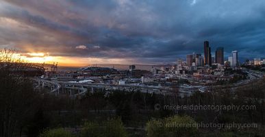 A dramatic sunset unfolds over Seattle as seen from Rizal Park, with light breaking through stormy clouds to illuminate the skyline and stadiums below. The warm glow of the setting sun contrasts beautifully against the cool tones of the encroaching evening, highlighting Lumen Field, T-Mobile Park, and the city’s high-rises.