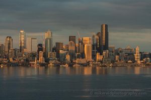 Golden evening light washes over the Seattle skyline as seen from Alki Beach, reflecting warmly across the calm waters of Elliott Bay. Iconic towers — from the Columbia Center to Smith Tower — glow beneath dramatic clouds, showcasing the city’s vibrant architecture in perfect balance with the soft tones of sunset.