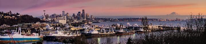A soft sunrise illuminates Seattle’s waterfront, with Pier 90’s fishing fleet resting in calm waters as the city skyline glows in the early morning light. Beyond the urban silhouette, Mount Rainier rises majestically on the horizon beneath a pastel sky.