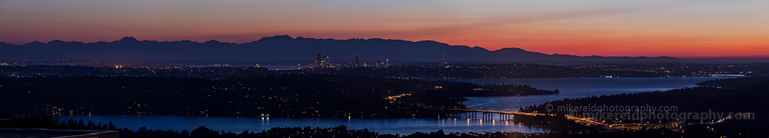 A stunning panoramic view captures Seattle’s skyline glowing at blue hour, framed by the calm waters of Lake Washington, Mercer Island’s silhouette, and the distant Olympic Mountains. Taken from the Somerset hills, this serene composition blends city lights, twilight hues, and natural beauty.