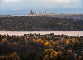 A sweeping view of the Seattle skyline as seen from Somerset, looking across Mercer Island and Lake Washington. Autumn colors glow in the foreground forests while the city’s towers, including the Space Needle, rise in the distance beneath the snow-dusted Olympic Mountains.